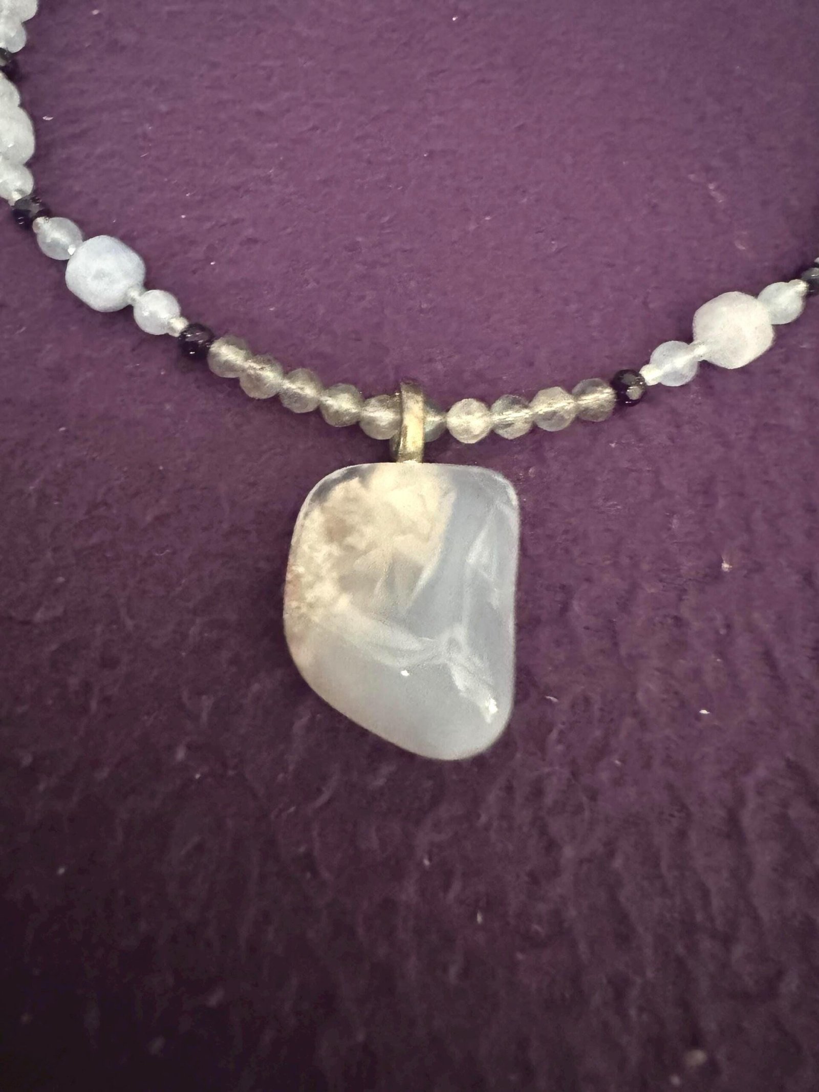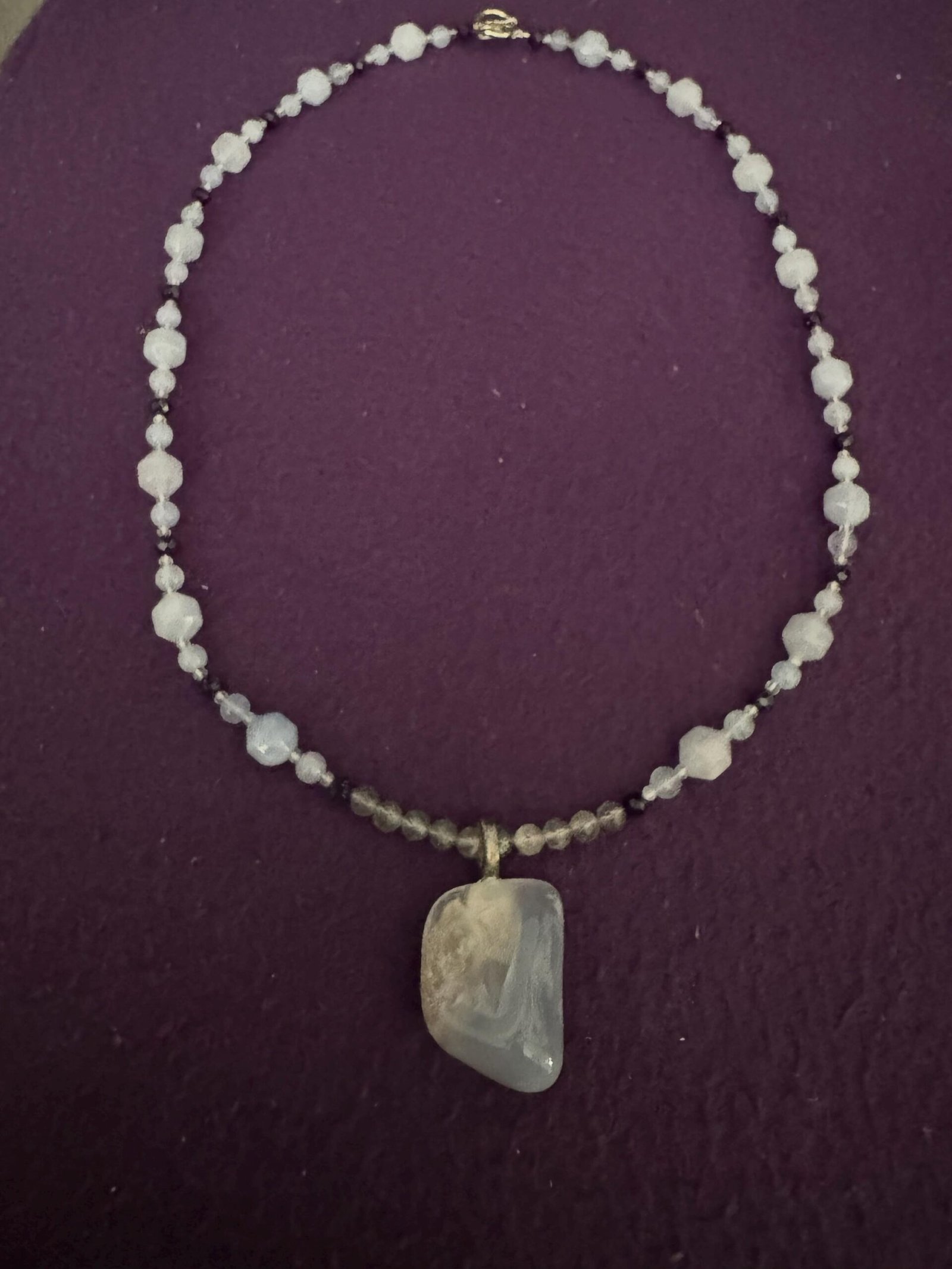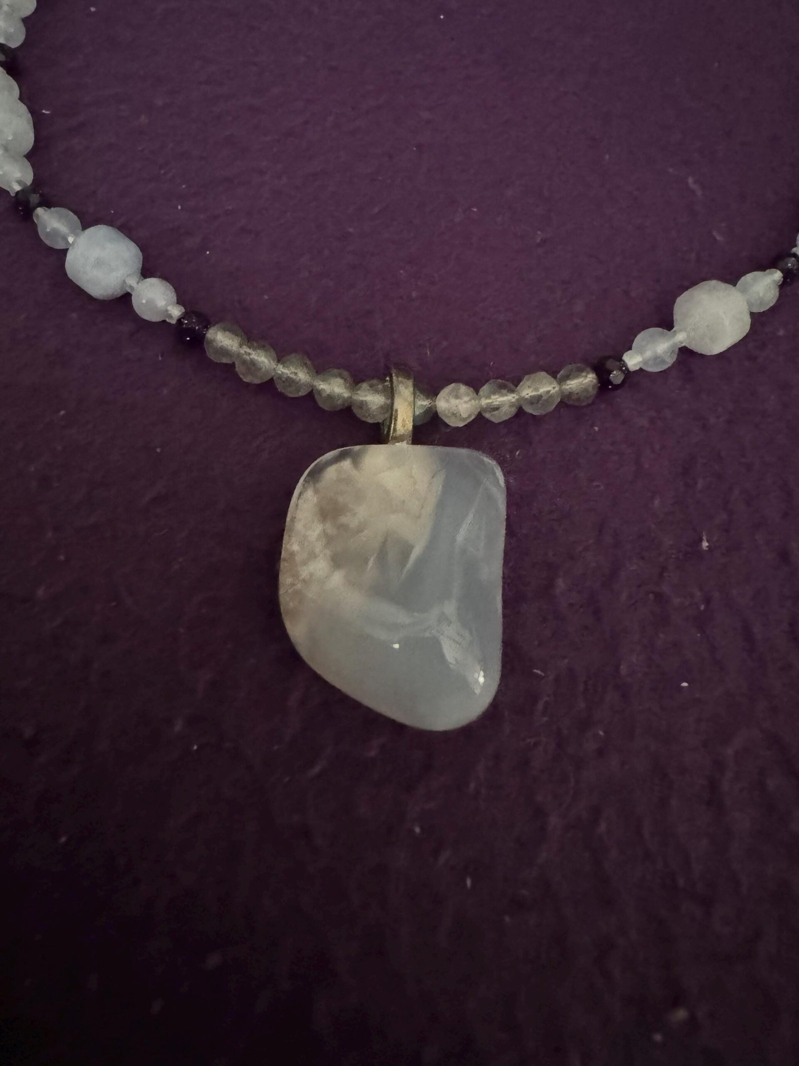 This elegant handmade jewelry set features a soothing Blue Chalcedony pendant, complemented by Labradorite, Blue Goldstone, and crystal glass beads that sparkle with subtle iridescence. The matching drop earrings complete this serene, celestial design.
