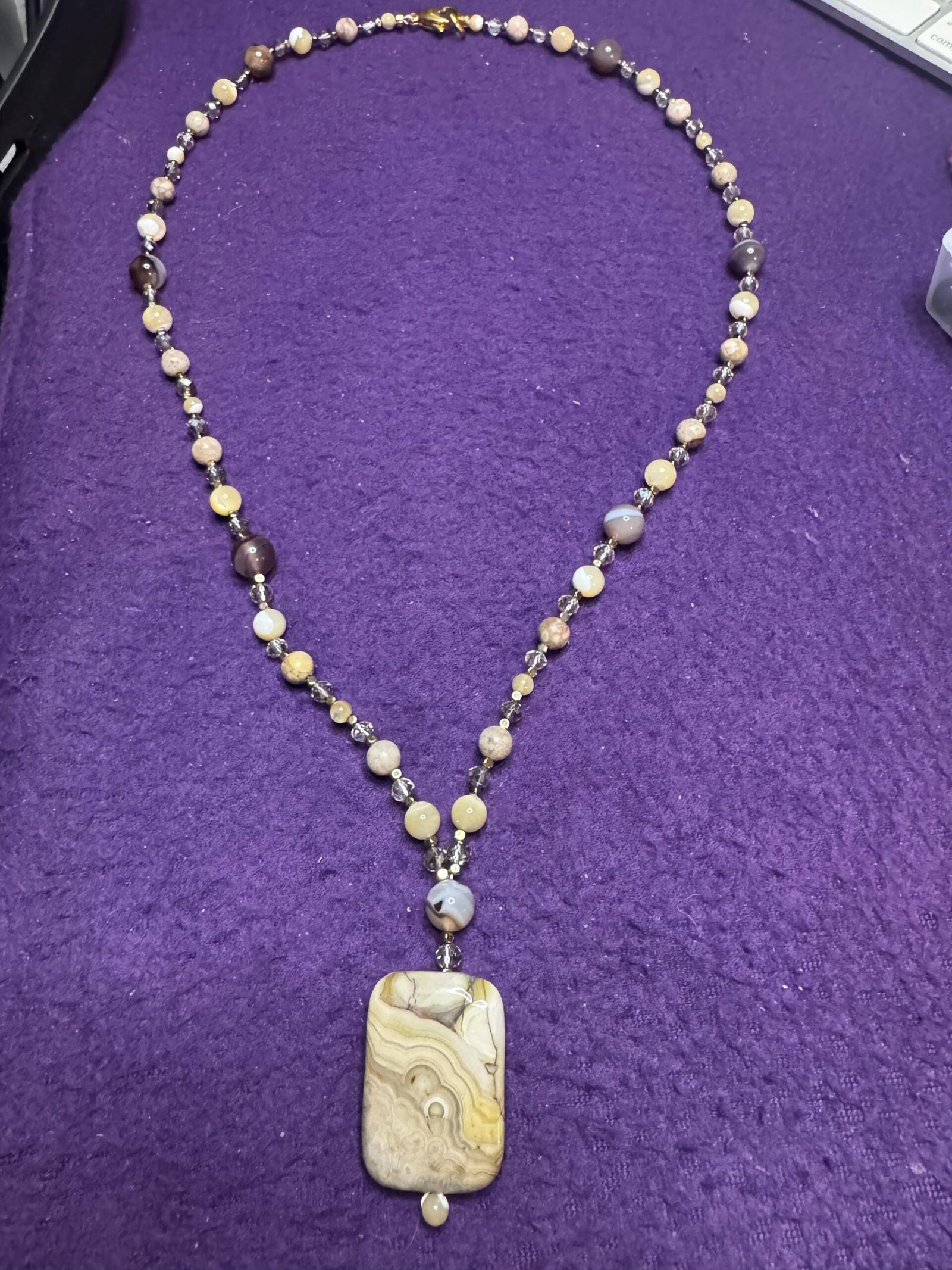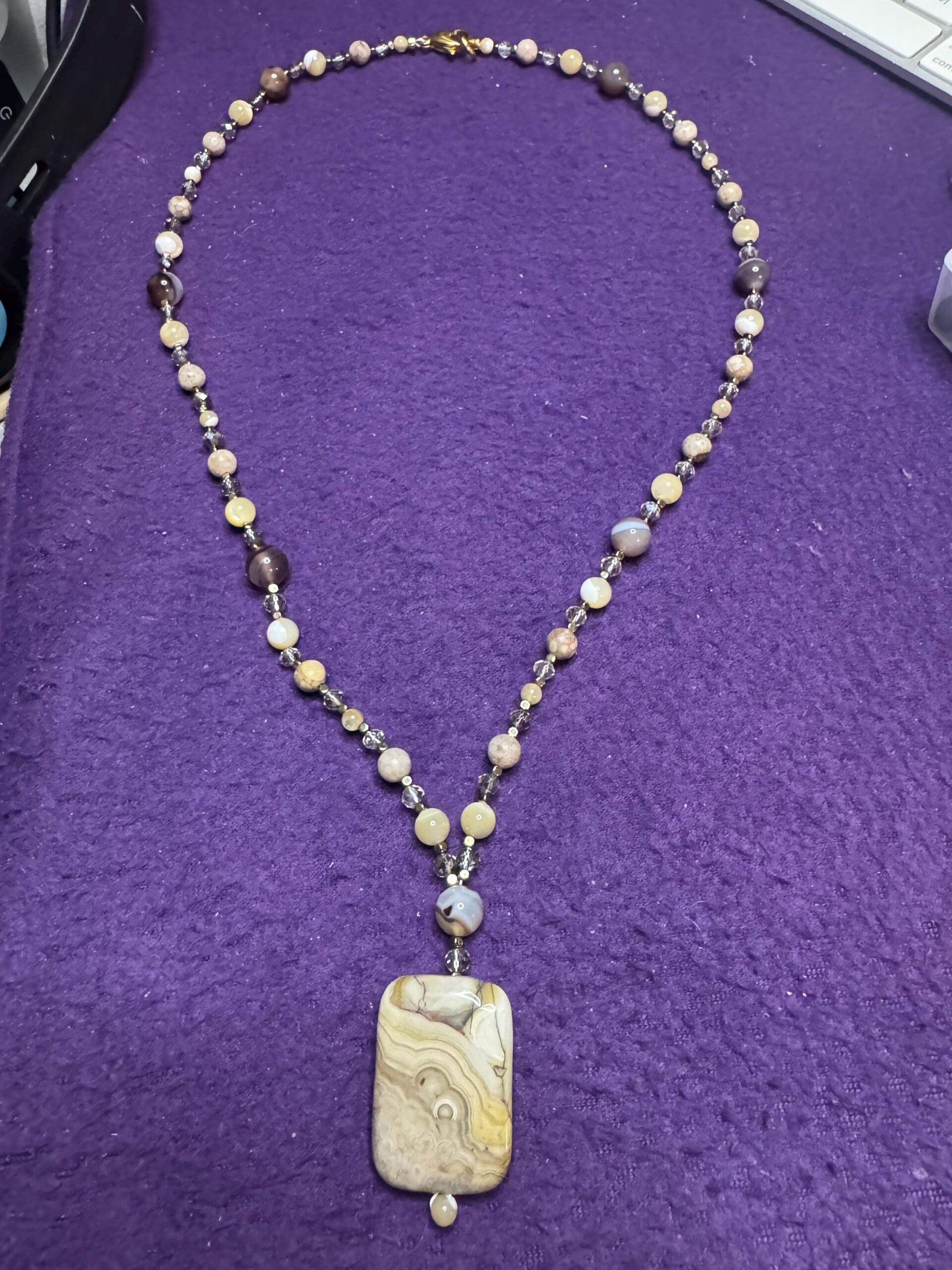 • Stones: Crazy Lace Agate (pendant), Leopard Jasper, Citrine, Agate, Faceted Crystal Beads