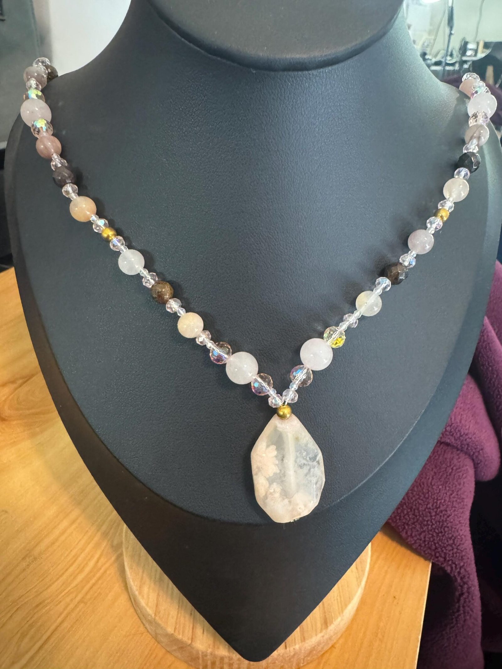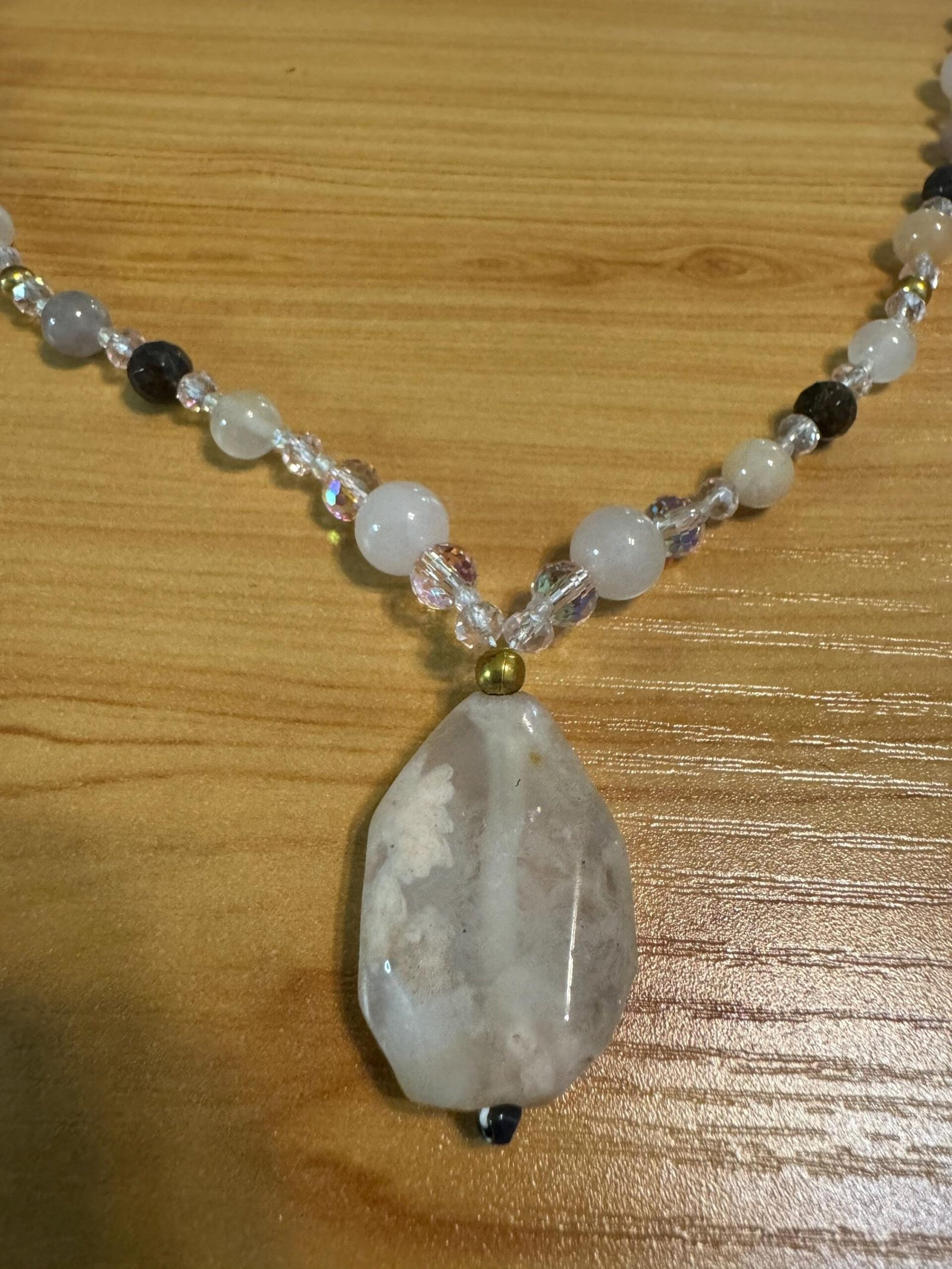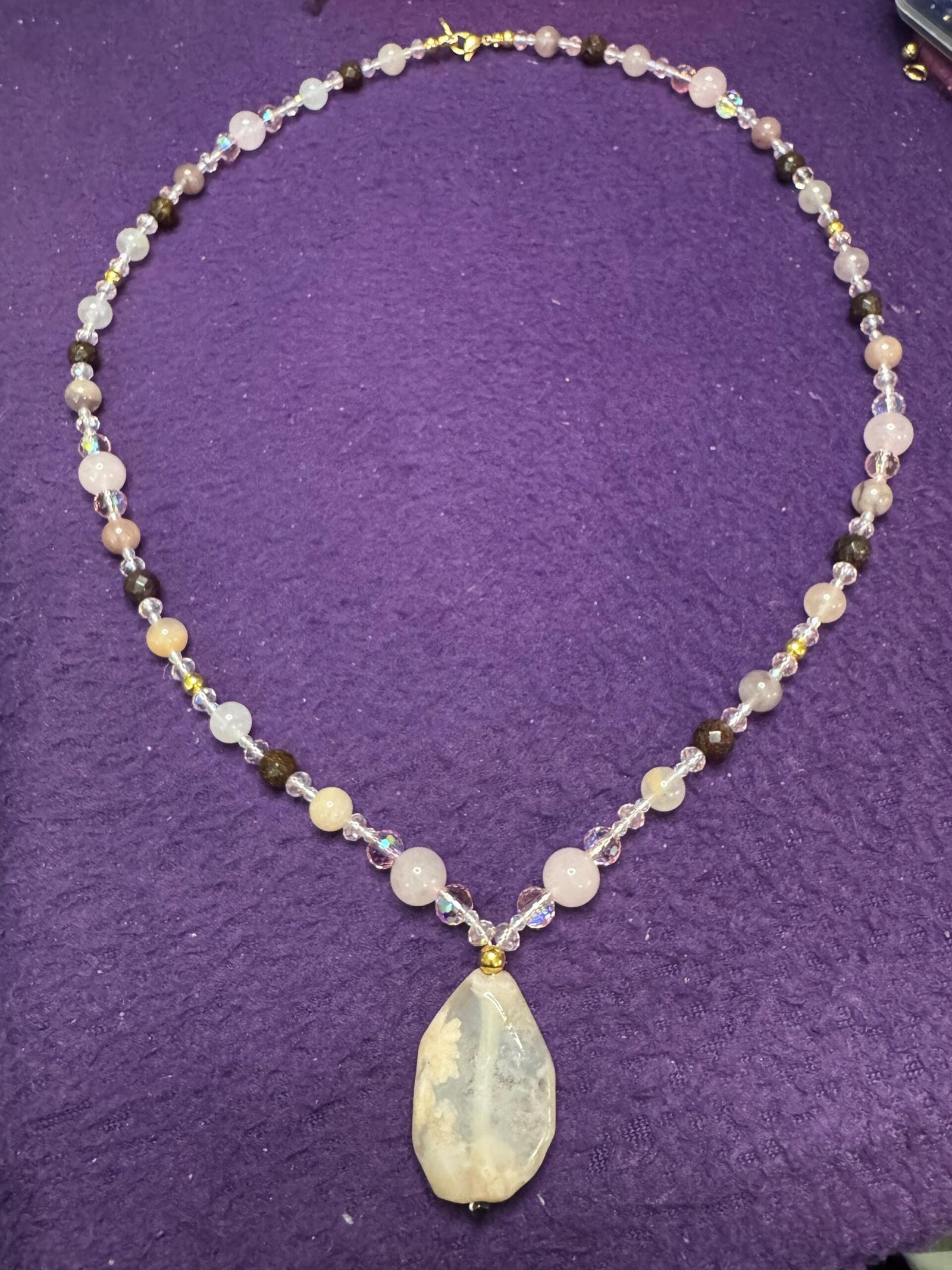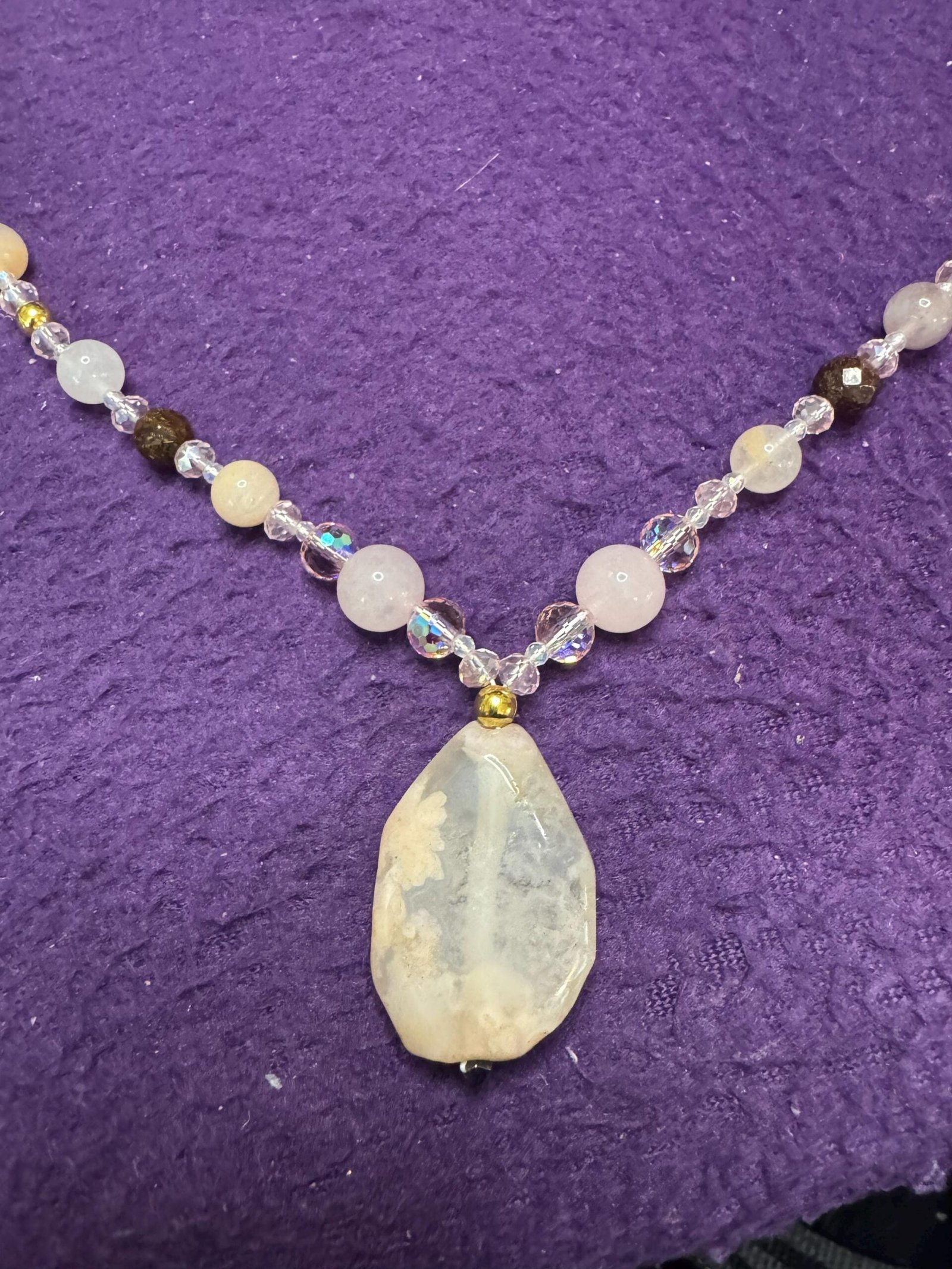 • Stones: Flower Agate (pendant), Rose Quartz, Bronzite, Clear Quartz, Glass Crystal beads
