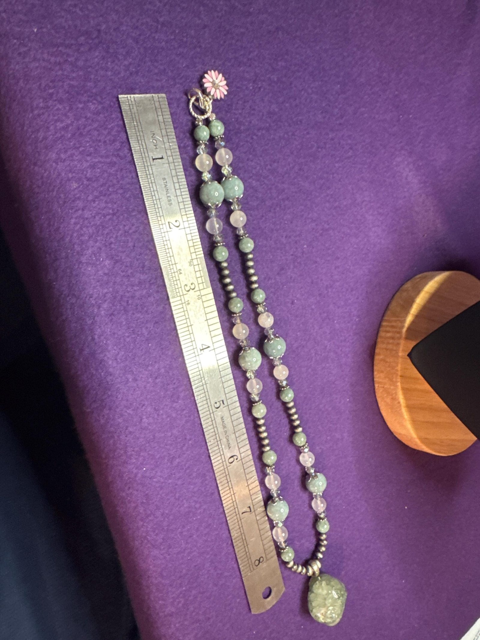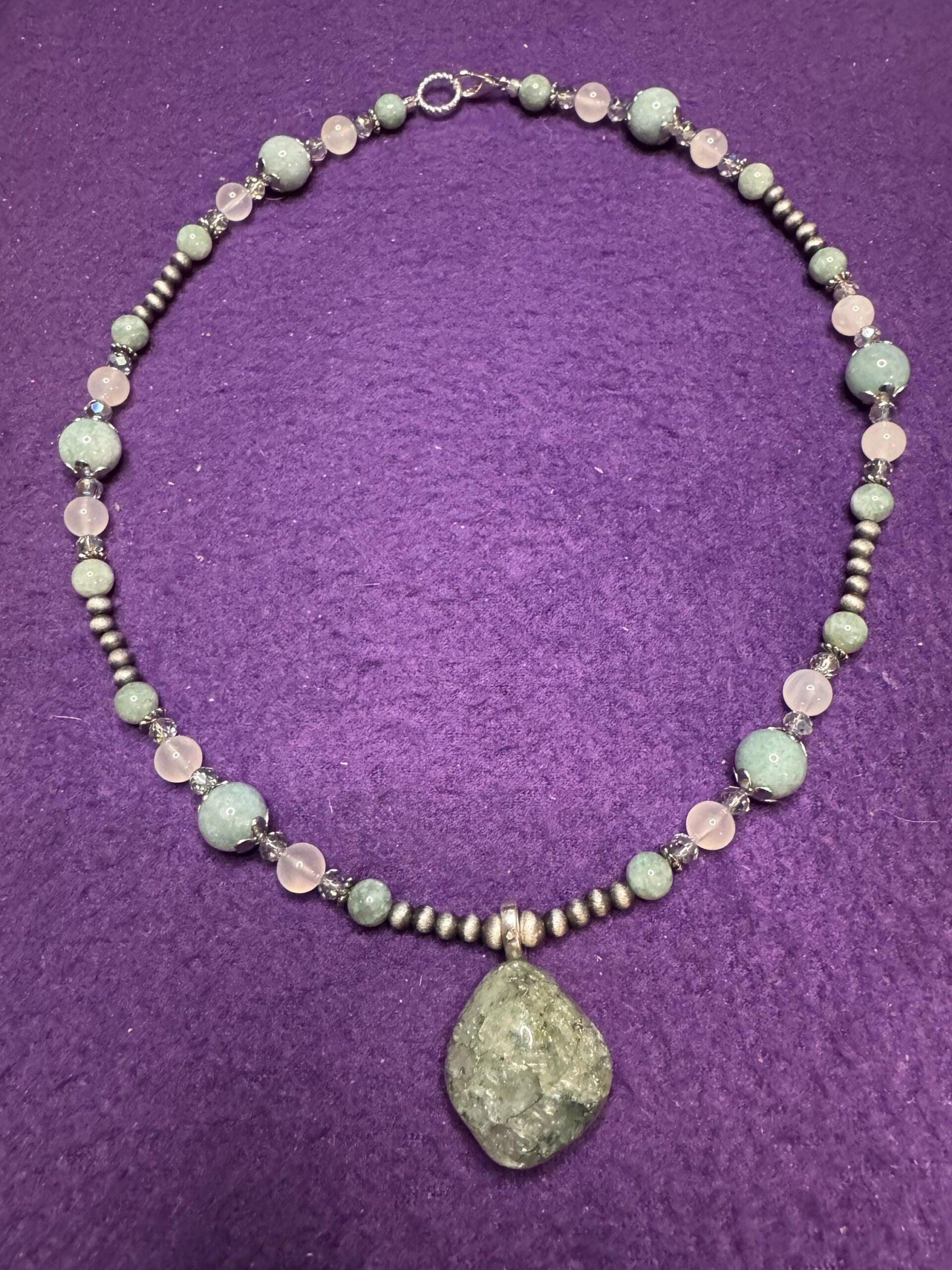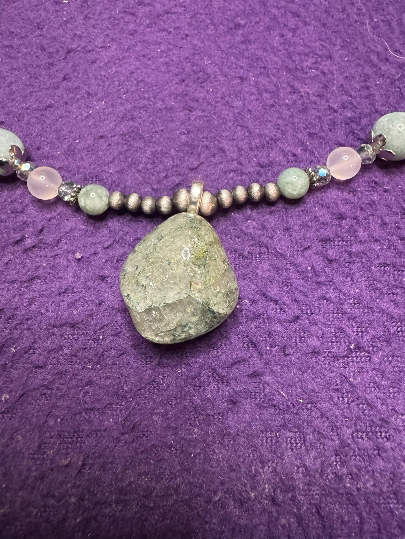 This elegant handmade necklace features a soothing Moss Aquamarine pendant complemented by soft Aventurine and Quartz beads with brushed silver metal accents. The gentle blue-green palette evokes ocean tranquility and grounded renewal, encouraging peace, clarity, and emotional flow.
