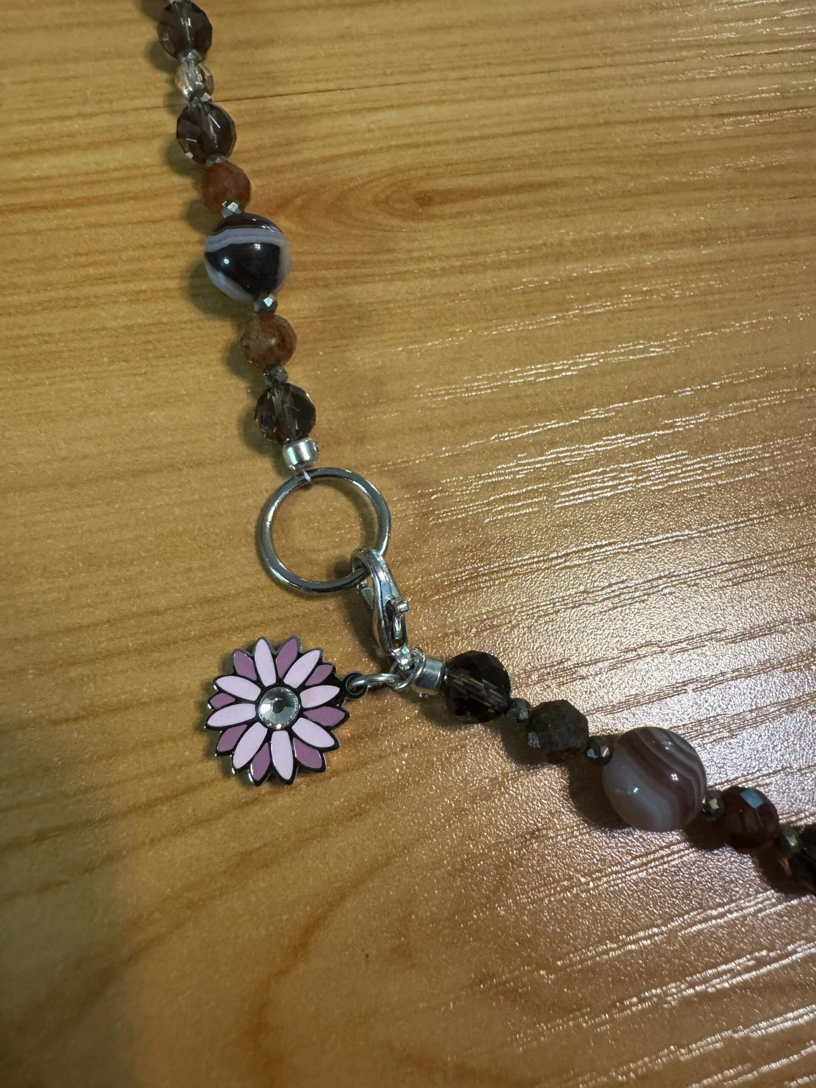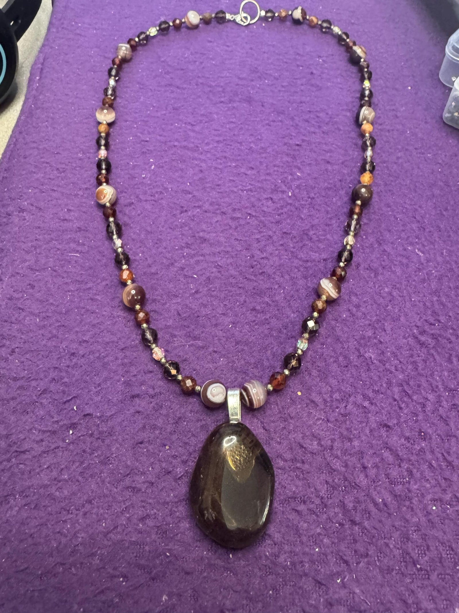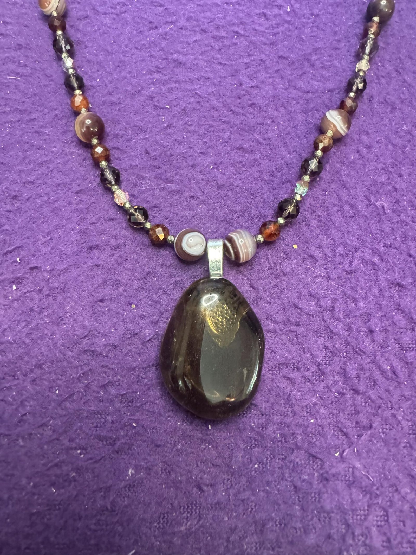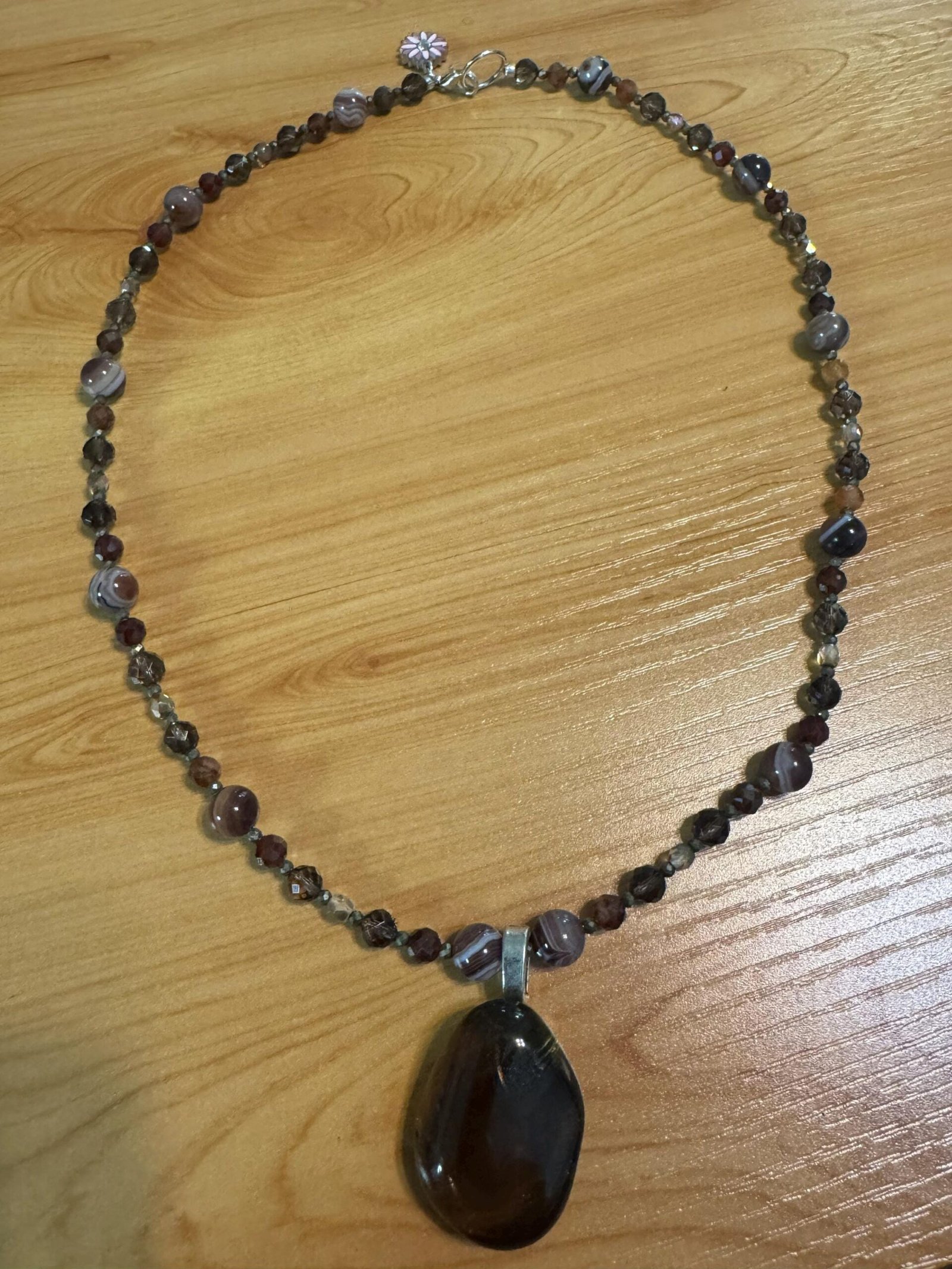 This handmade necklace features a rich Smoky Quartz pendant accented with Banded Agate, natural Citrine, and faceted glass crystals for a touch of sparkle. Warm amber tones blend with deep earthy browns to create a piece that feels grounding, balanced, and full of subtle light.