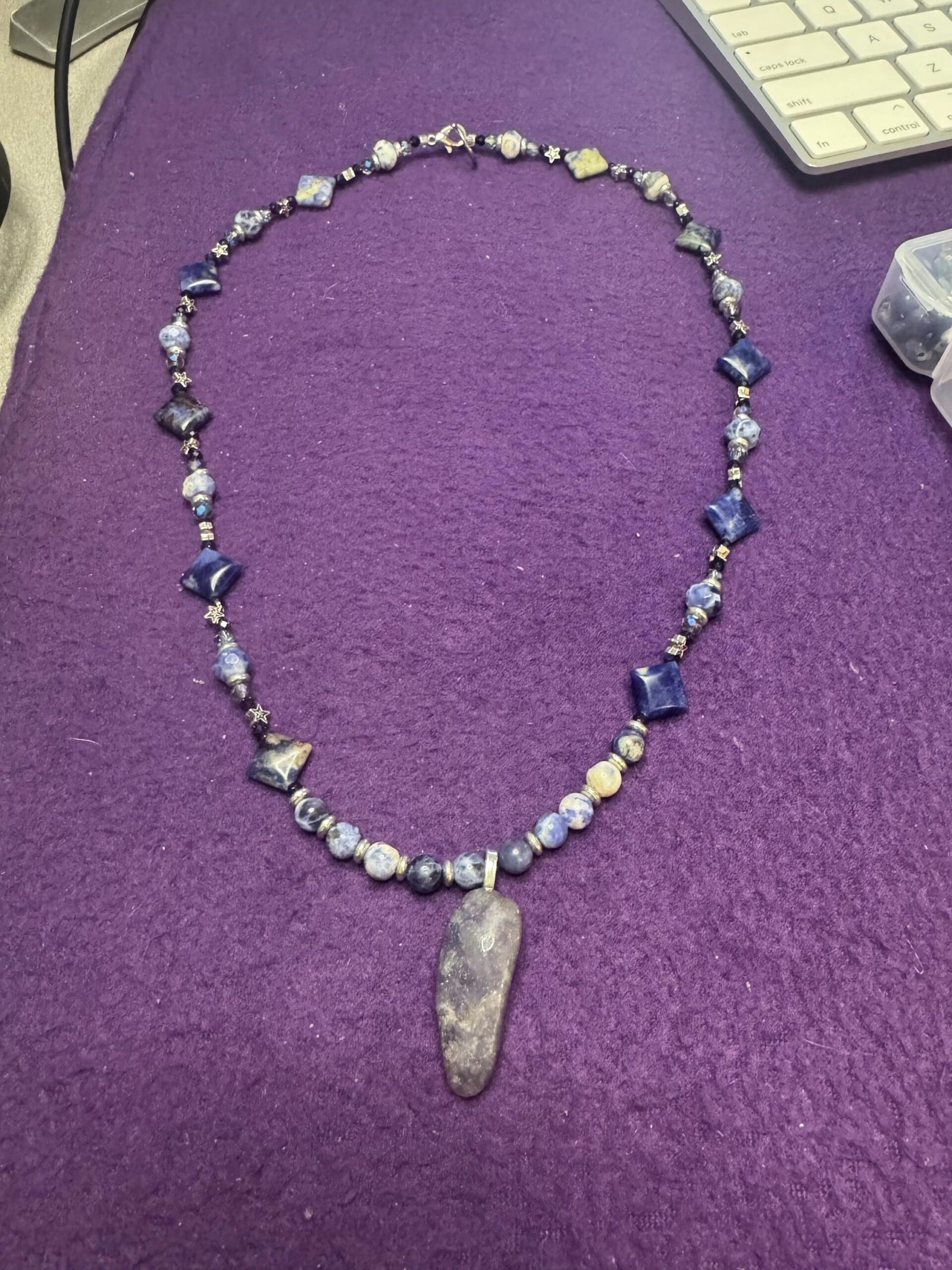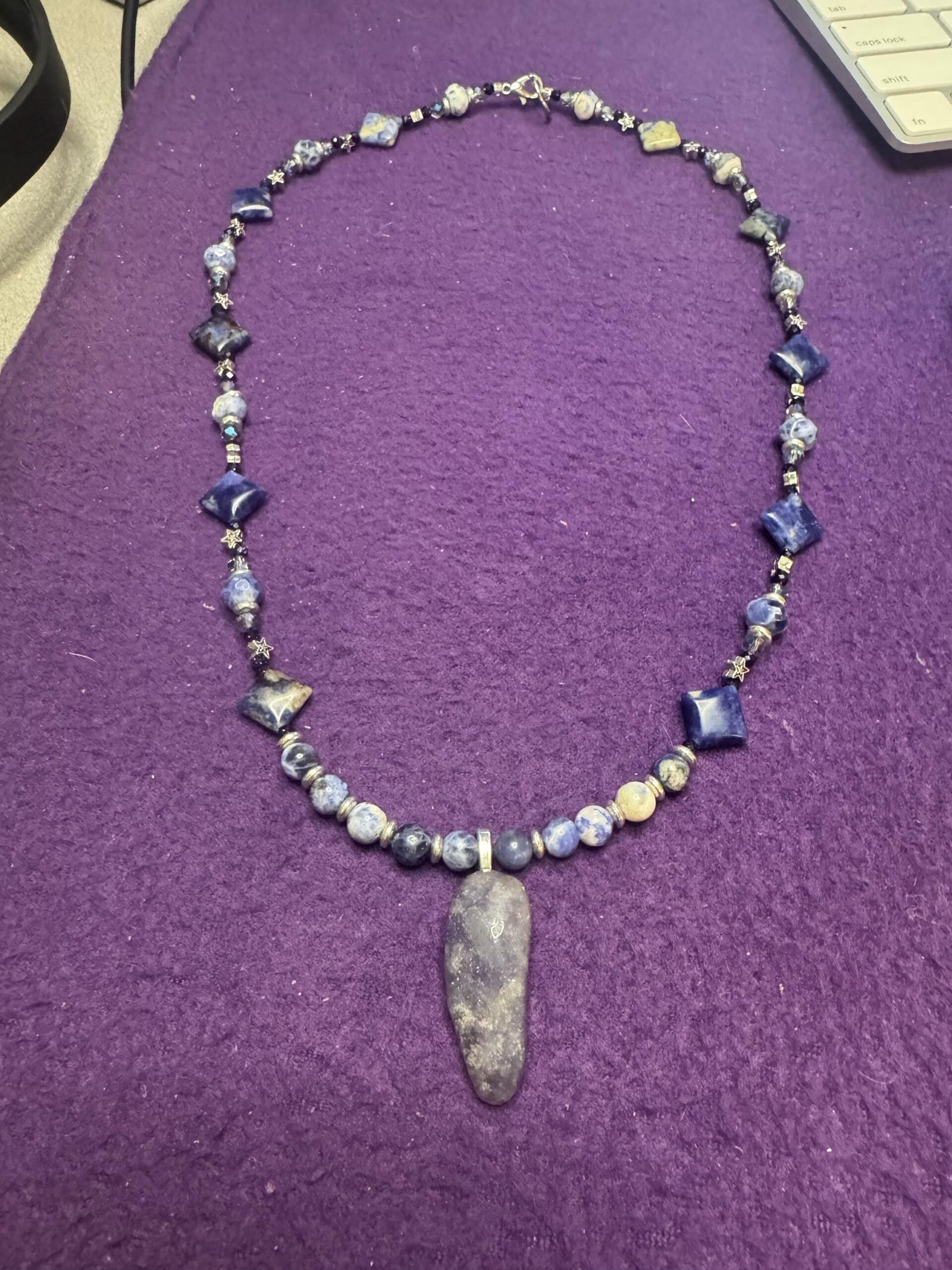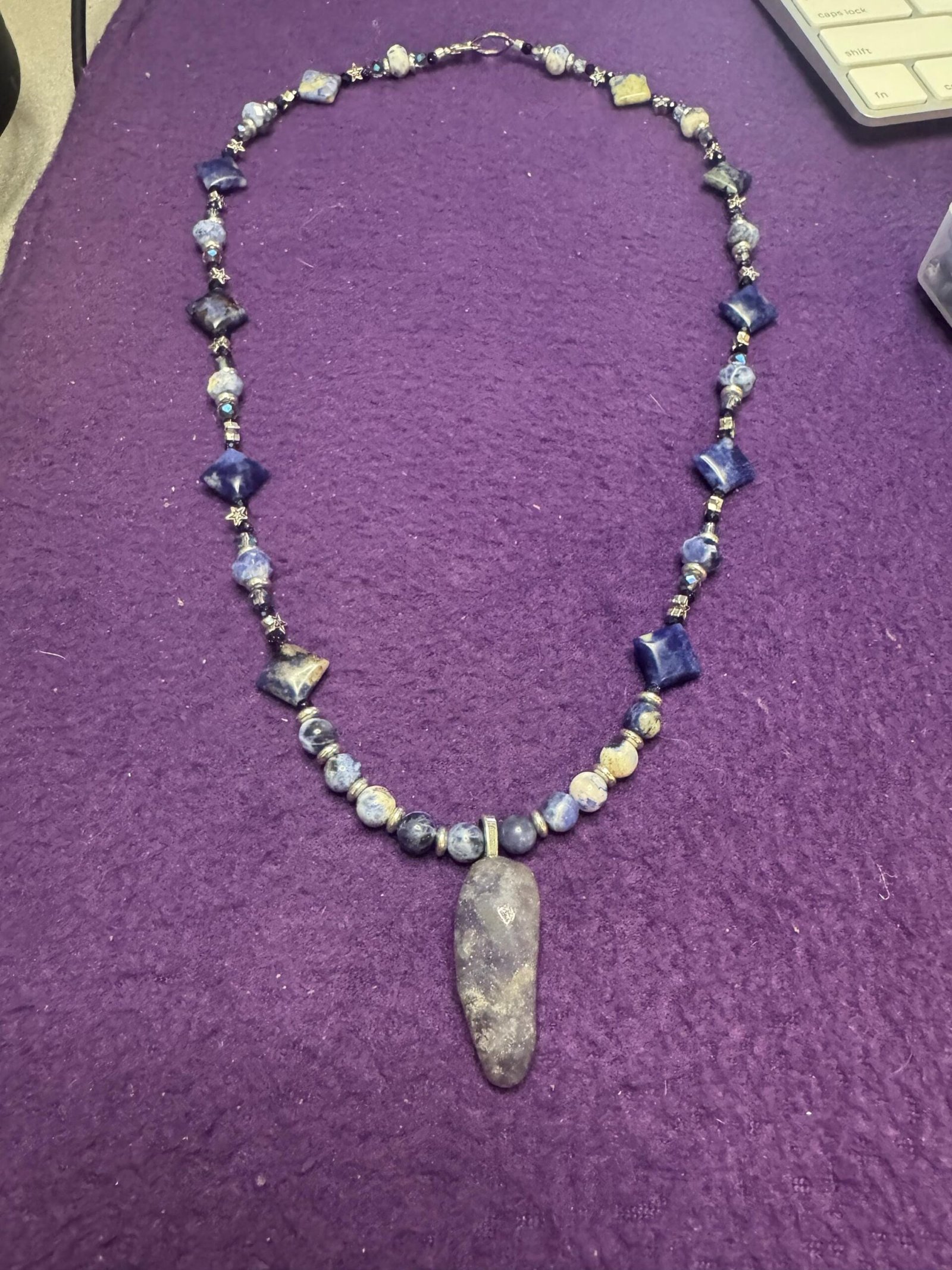 This handmade necklace combines the deep celestial hues of Sodalite and Lapis Lazuli with shimmering glass beads, silver-tone metal spacers, and star accents that evoke the beauty of the night sky. The centerpiece is a smooth, naturally shaped stone pendant, grounding the piece with organic charm.